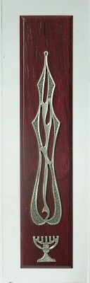‟Lev Segal‟ Purple heart wood mezuzah case with nickel plated menorah and flame with the letters shin-daled-yud. Self adhesive mounting.