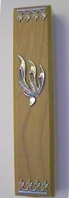 Rectangular natural wood mezuzah case with 925 sterling silver letter shin and trim. Self adhesive mounting.