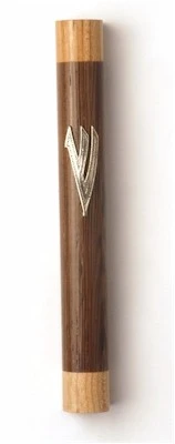 Round two-tone natural wood mezuzah case with 925 sterling silver letter shin. Self adhesive mounting.